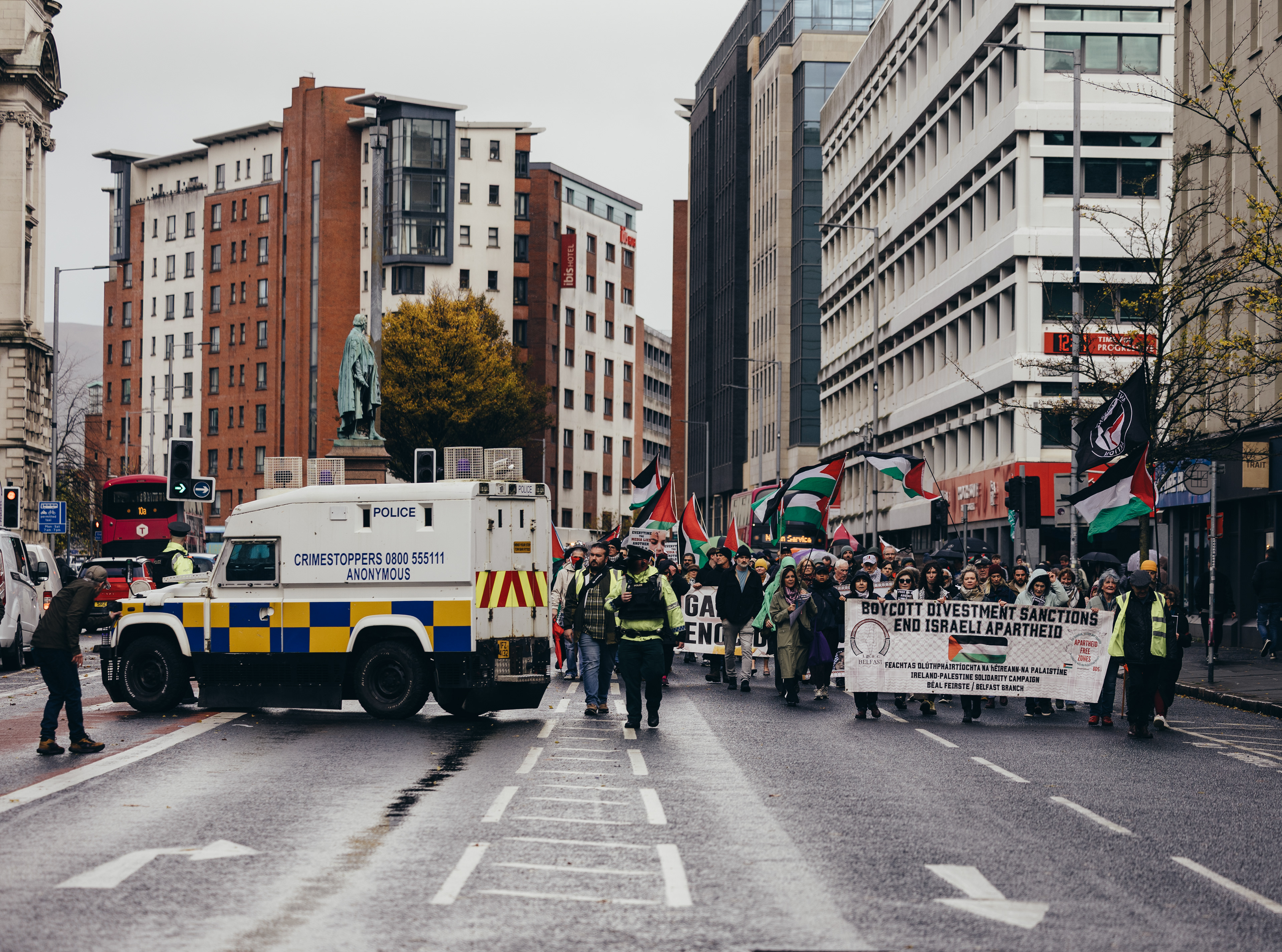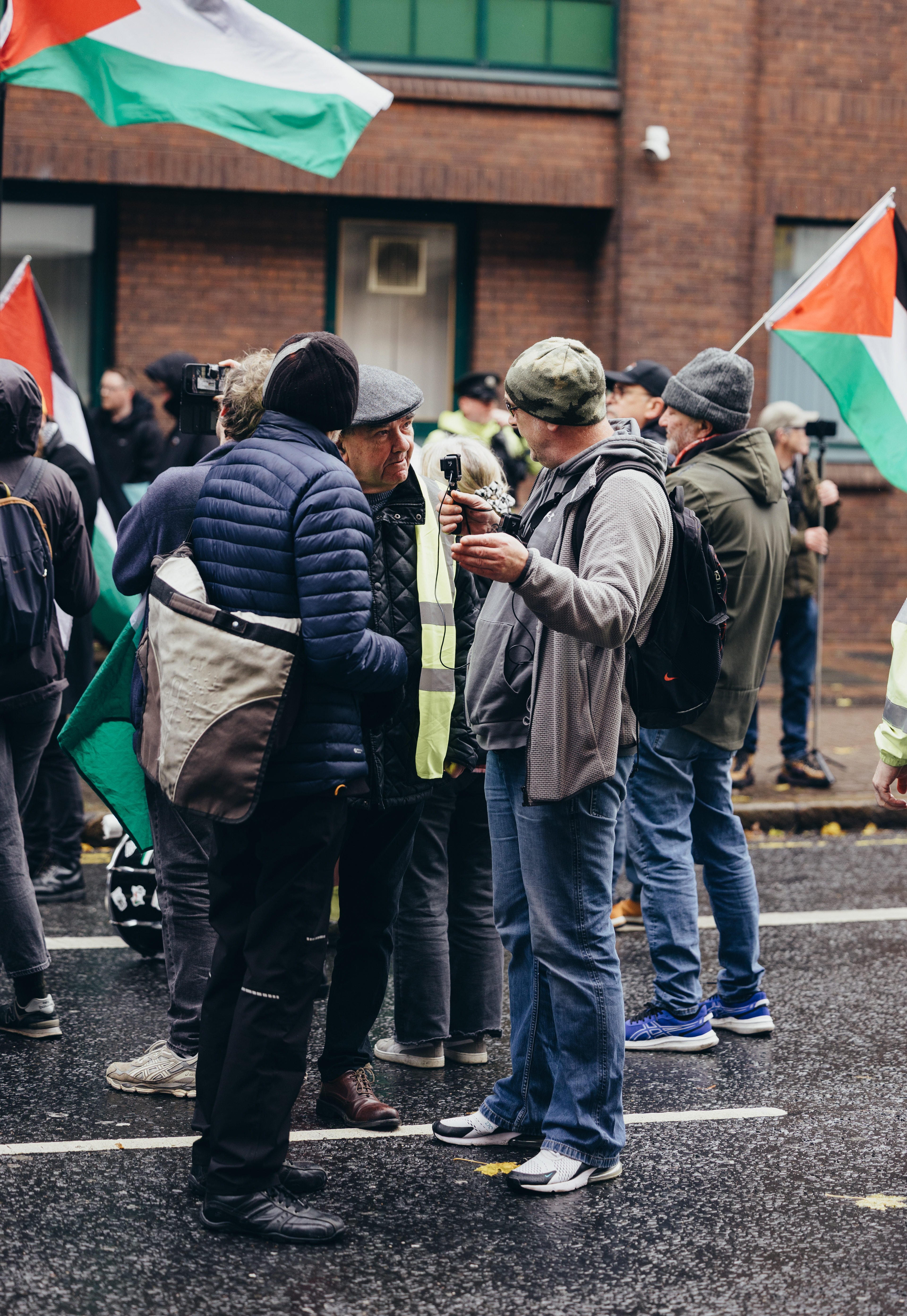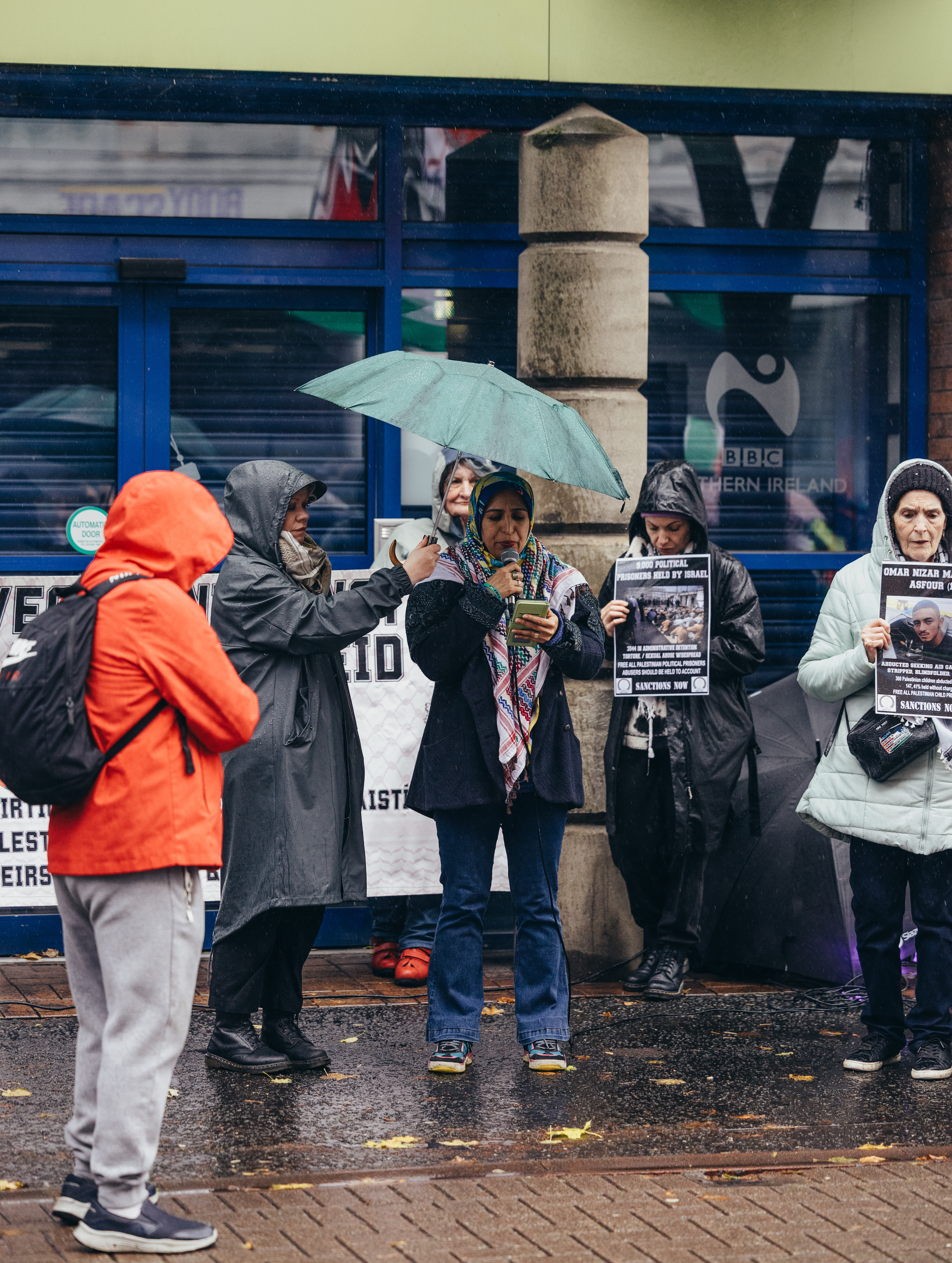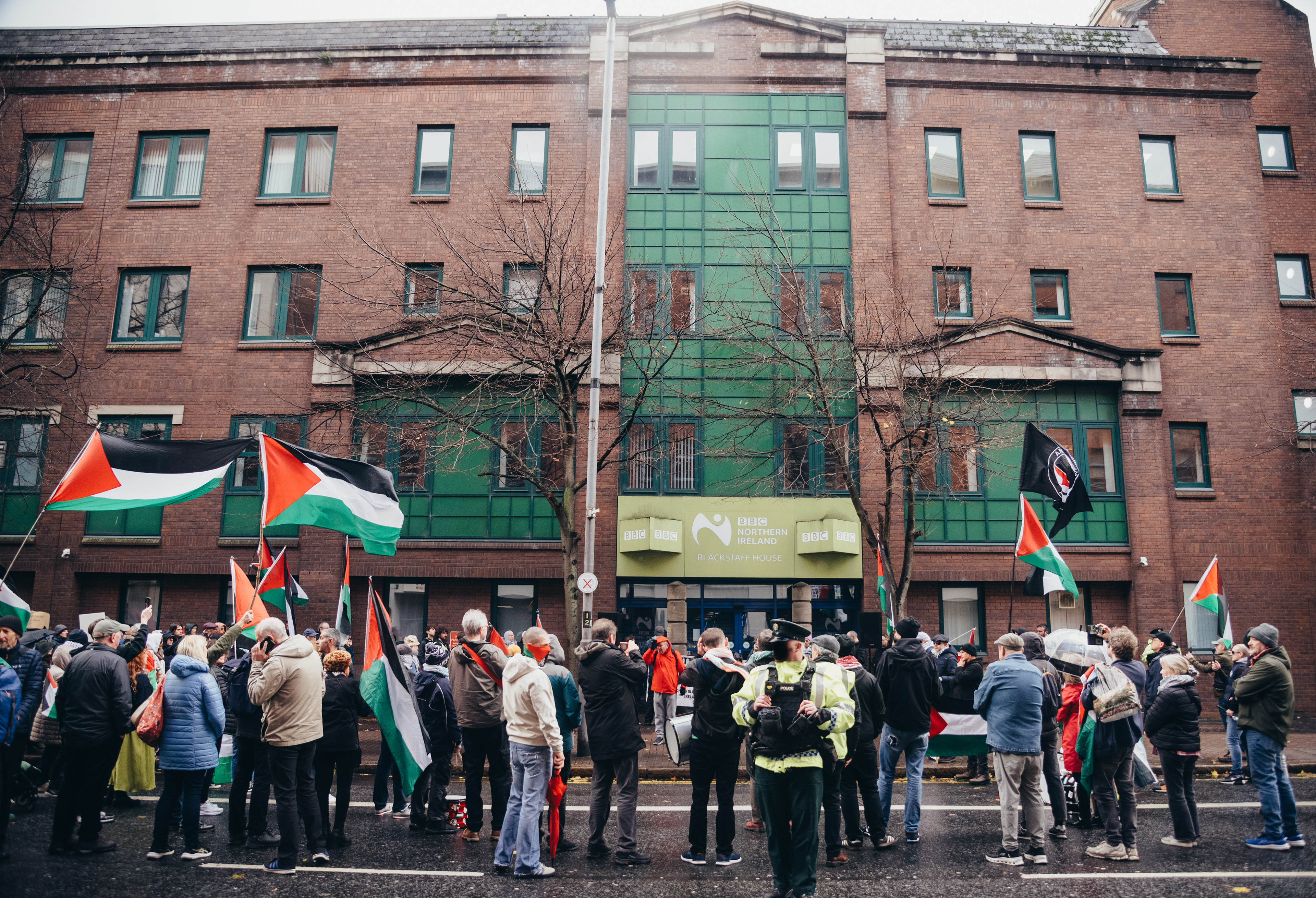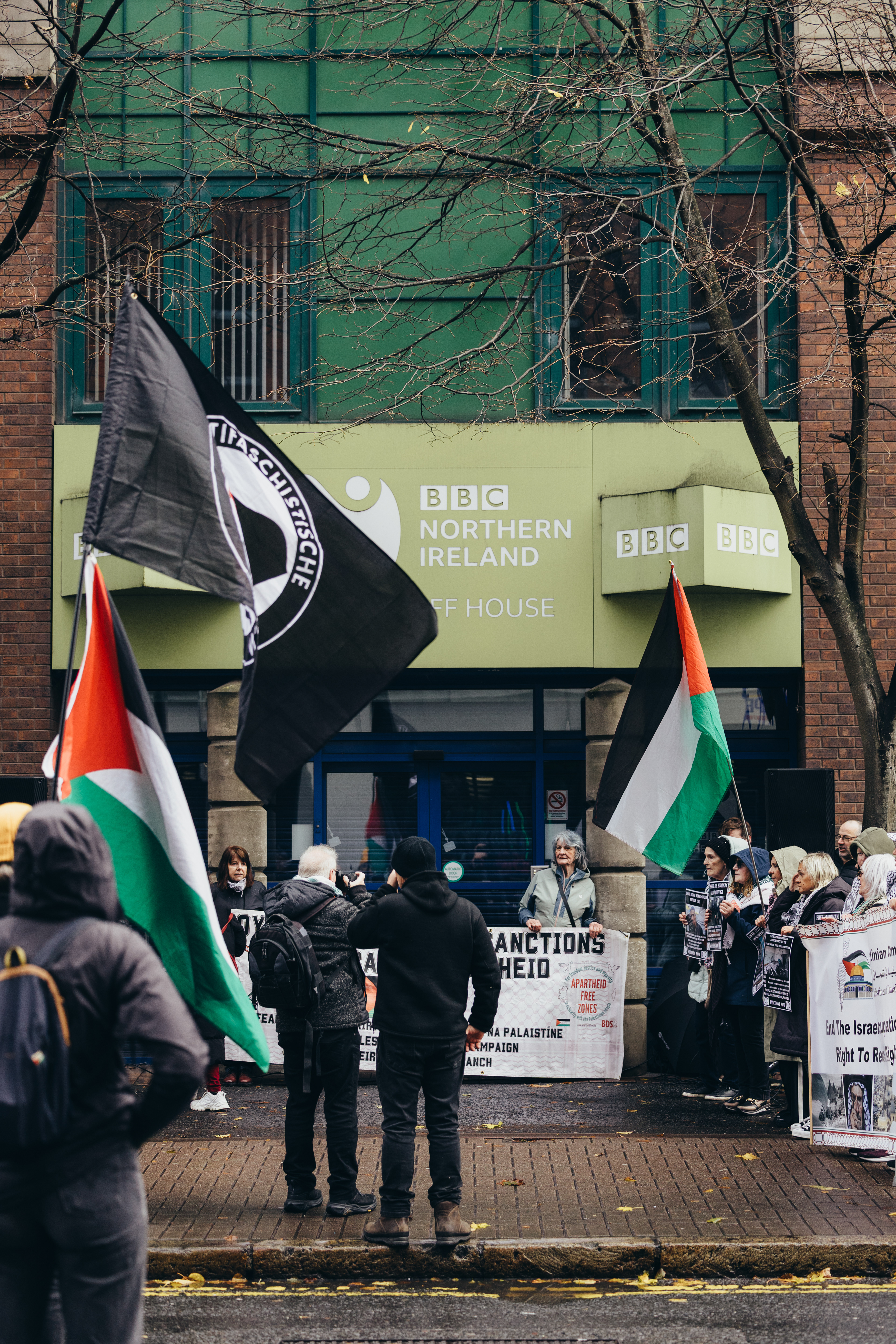 25 October 2025 - A march to the BBC Blackstaff to protest the genocide in Gaza. The march was harried along the entire route by far right vloggers who the PSNI seemingly decided to just not bother policing.